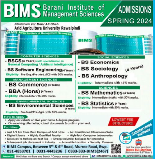 Barani Institute of Management Sciences BIMS has announced admissions 2024 for BS Degree in Computer Science, Software Engineering, Commerce, Economics, Sociology, Anthropology, Mathematics, Statistics, Environmental Science,BBA. Eligible students can apply for academic admissions 2024 in Barani Institute of Management Sciences BIMS Rawalpindi Punjab Pakistan for Science University. Students for admissions in BS and BBA can apply for online or campus classes as per Private institute criteria till admission closing date March 4, 2024. Read newspaper ad for exact details.