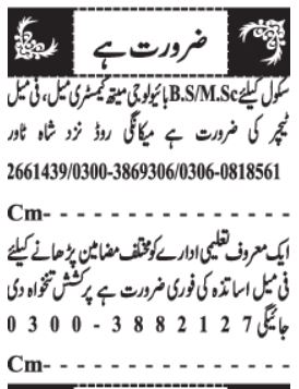 Private School McConaghey Road Quetta, quetta Balochistan Pakistan invites applications from eligible candidates for the post of female teacher, maths teacher, teacher, chemistry teacher and biology teacher as per advertisement of June 17, 2025 published in daily Jang Newspaper. Persons with MS, Others, Bachelor and Master etc. education can apply.