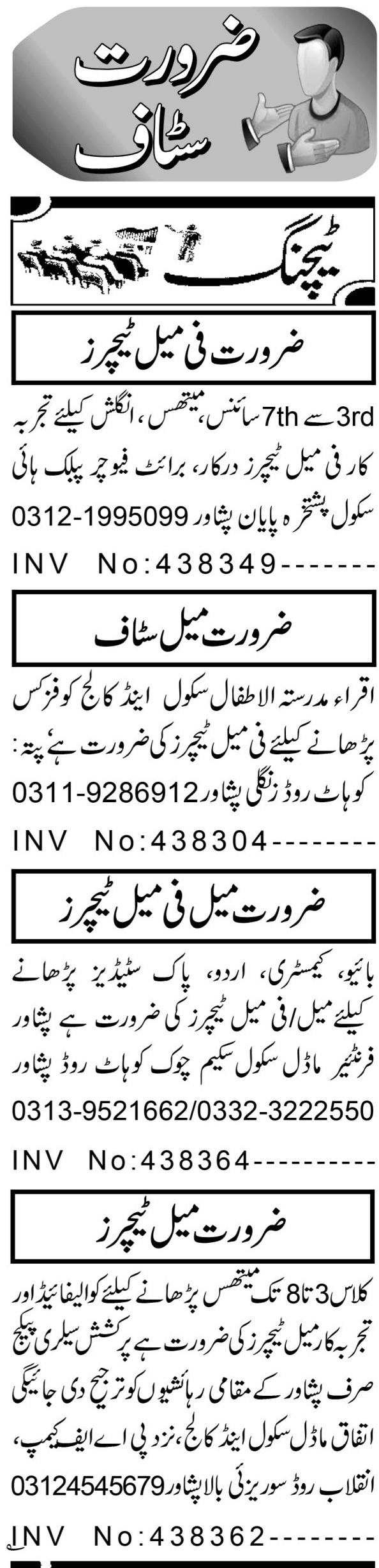 Private School jobs advertisement dated about 24 January 2025 in daily Aaj Newspaper invites application for the vacant post of physics teacher, biology teacher, science teacher, mathematics teacher, lady teacher, pak studies teacher, urdu teacher, english teacher and teacher in Peshawar, peshawar Khyber Pakhtunkhwa KPK Pakistan. Persons with M.sc, Master, MA, BA and Bachelor etc. education can apply.