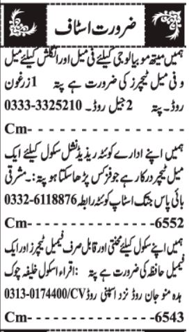 Private School invites applications for job positions advertised in daily Jang dated 8 March 2025 for following vacancies in Spinny Road Quetta, quetta Balochistan Pakistan.