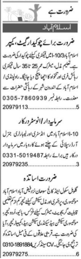 Vacant posts including investor, computer teacher, physics teacher, aya, section head, gate keeper, chowkidar, urdu teacher, biology teacher, teacher, lady teacher and montessori section head are announced in Private Company I-10 Islamabad, islamabad Islamabad Pakistan as per 9 August 2025 advertisement in daily Express Newspaper. Preferred Education is Middle, Bachelor, Matric, M.sc, Master, Primary, Others and MA etc.