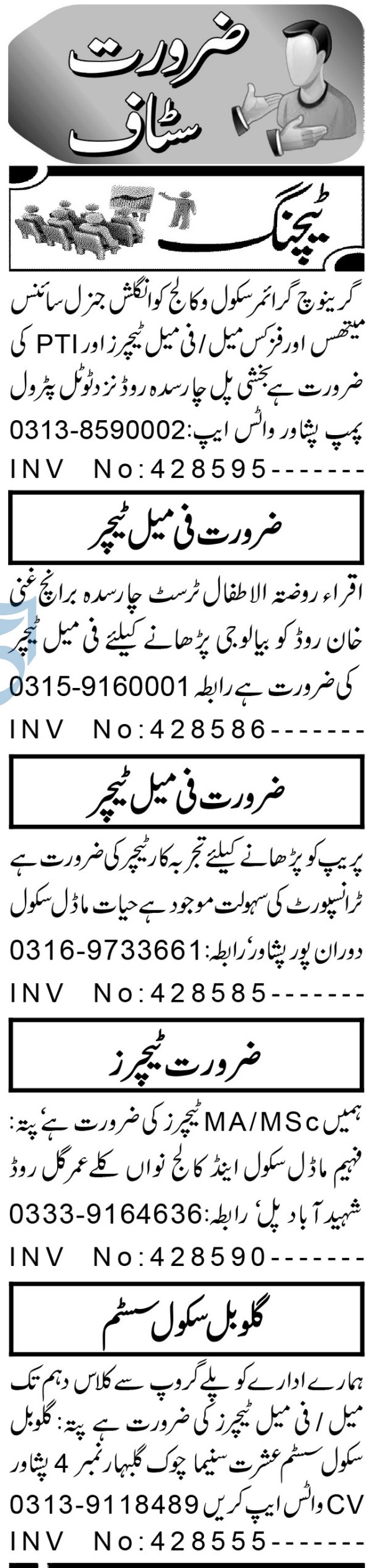 Private School Peshawar, peshawar Khyber Pakhtunkhwa KPK Pakistan invites applications from eligible candidates for the post of teacher, mathematics teacher, general science teacher, english teacher, prep class teacher, lady teacher, playgroup teacher, physics teacher and pti as per advertisement of January 31, 2024 published in daily Aaj Newspaper. Persons with M.sc, BA, Master, B.ed, MA and Bachelor etc. education can apply.