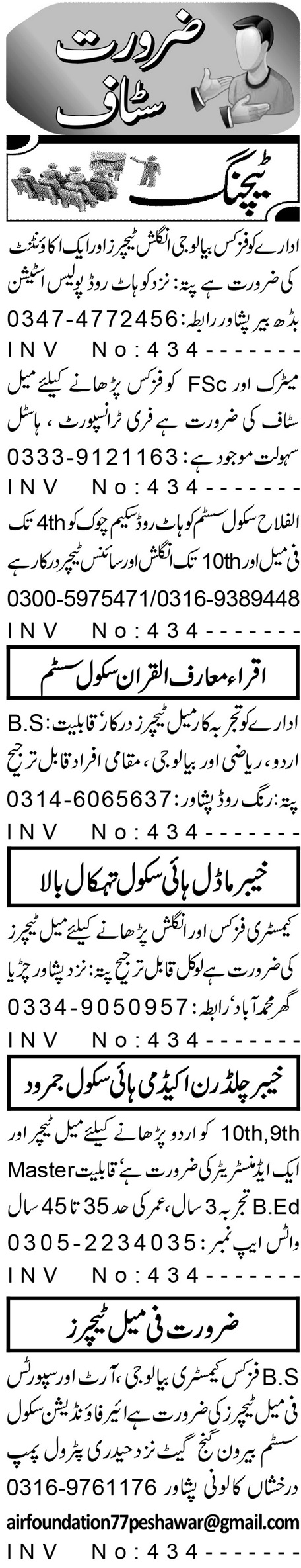 Vacant posts including urdu teacher, mathematics teacher, sports teacher, accountant, physics teacher, science teacher, biology teacher, teacher, art teacher, english teacher, female teacher and administrator are announced in Private School Peshawar, peshawar Khyber Pakhtunkhwa KPK Pakistan as per 28 September 2024 advertisement in daily Aaj Newspaper. Intermediate, M.sc, BBA, B.com, MA, B.ed, Master, BA and Bachelor etc. educational qualification will be preferred.