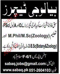 Biology Teachers are required in Sabaq Foundation Trust in Islamabad.