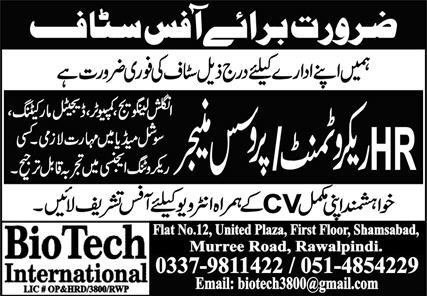BioTech International invites applications for job positions advertised in daily Express dated 28 October 2025 for following vacancies in Shams Abad Rawalpindi, rawalpindi Punjab Pakistan.