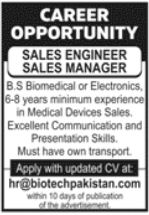 Biotech Pakistan Pvt Ltd Lahore, lahore Punjab Pakistan invites applications from eligible candidates for the post of sales manager and sales engineer as per advertisement of March 7, 2022 published in daily Jang Newspaper. Persons with Master and Bachelor etc. education can apply.