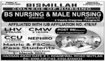 Bismillah College of Nursing BS Nursing & Male Nursing, LHV, CMW, CCU admissions 2024 has been announced. Eligible students can apply for academic admissions 2024 in Bismillah College of Nursing Multan Punjab Pakistan for Medical Medical College. Eligible students for fulfilling criteria for admissions in BS can enroll as per Government admission policy 2024 till closing date 4 July 2024. Read newspaper ad for exact details.