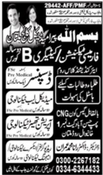 Bismillah Paramedical College admissions 2023 for Pharmacy Technician, B pharmacy, Diploma in Dispenser, Medical Lab Technology, Operations Theater Technology, Radiography & Xray Technology, has been announced. Eligible students can apply for academic admissions 2023 in Bismillah Paramedical College Multan Punjab Pakistan for Medical Medical College. Students who want to enroll for academic session 2023 in Course, Diploma and B Pharmacy qualification and admission criteria for Private institute can apply till last date 5 December 2023. Read newspaper ad for exact details.