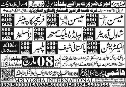 Hashmi Trade Test & Technical Training Center jobs advertisement dated about 5 March 2025 in daily Express Newspaper invites application for the vacant post of electrician, translator, welder, pakistani chef, shawl operator, block mason, plumber, blacksmith, plaster mason, furniture carpenter, ceramic tile mason and mason in Baghdad, basra Iraq. Candidates with Intermediate, Bachelor and Matric etc. educational background will be preferred.