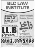 BLC Law Institute is a private university invited applications for online admissions in Bachelor of Laws LLB 5 Years Degree Programs in Lahore Punjab Pakistan 2020. Read newspaper ad for exact details.