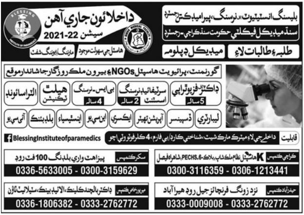 Admissions in Blessing Institute of Medical Sciences BIMS 2022 for DPT, Doctor of Physical Therapy, Nursing Assistant, Diploma, BS Nursing, Health Technician, Ultrasound Technician, Course, Laboratory, Dispenser, Operation Theater, X Ray, NCU, Blood Bank, ICU has been announced. Eligible students can apply for academic admissions 2022 in Blessing Institute of Medical Sciences BIMS Hyderabad Sindh Pakistan for Medical Medical College. Students who want to enroll for academic session 2022 in Diploma, Course and DPT qualification and admission criteria for Private institute can apply till last date 26 April 2022. Read newspaper ad for exact details.