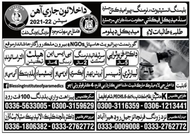 Blessing Institute of Nursing and Paramedics is offering admissions in different disciplines of DPT, CNA, BSN, Health Technician, Dispenser, OTT, ICU Technician, XRAY Technician, Anesthesia Technician, Laboratory Technician Ultrasound Technician in Hyderabad and Karachi. Read newspaper ad for exact details.
