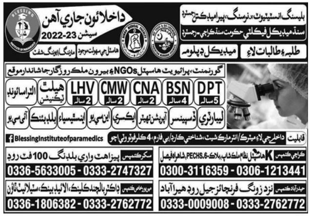 Blessing Institute of Nursing and Paramedics has announced admissions 2023 for Doctor of Physical Therapy DPT, Bachelor of Science in Nursing BSN, Community Midwife CMW, Lady Health Visitor LHV, Health Technician, Ultrasound Technician, Laboratory Technician, Dispenser, Operation Theatre Technician. Eligible students who qualify as per admission criteria in Blessing Institute of Nursing and Paramedics Karachi Hyderabad, Sukkur, and Mirpur Khas Sindh Pakistan can apply in Medical College for academic year 2023. Students who want to enroll for academic session 2023 in DPT, Diploma and BSN qualification and admission criteria for Private institute can apply till last date 7 June 2023. Read newspaper ad for exact details.