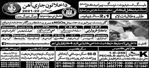Blessing Institute of Nursing & Paramedics has announced admissions for paramedical diploma in DPT, CNA, Health Tech, Ultrasound, Laboratory, Dispenser, OT, X-Ray, NCU, Anesthesia, Blood Bank and ICU. Read newspaper ad for exact details.