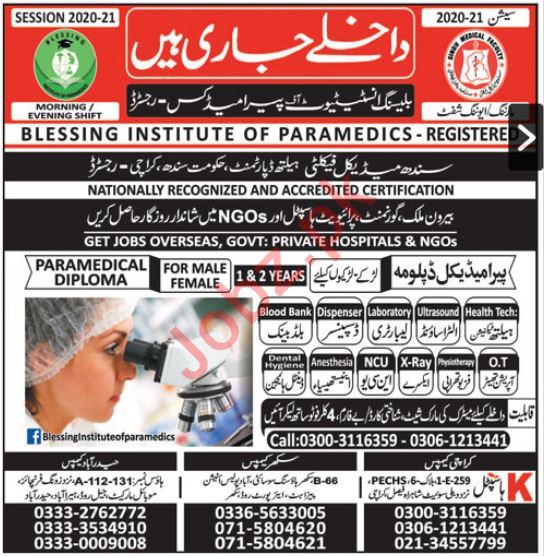 Blessing Institute of Paramedics is offering admissions in Paramedical Diploma in Health Technician, Ultrasound, Laboratory, Dispenser, Blood Bank, Operation Theater, Physiotherapy, X Ray, NCU, Anesthesia, Dental Hygiene in Karachi, Sukkur and Hyderabad. Read newspaper ad for exact details.