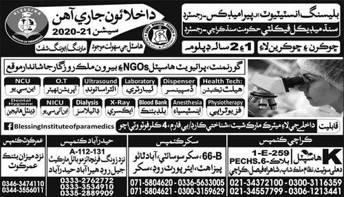 Blessing Institute of Paramedics is offering admissions for paramedical diploma in Health Technician, Dispenser, Laboratory, Ultrasound, OT, NCU, Physiotherapy, Anesthesia, Blood Bank, X-Ray, Dialysis, NICU and Dental Hygiene. Read newspaper ad for exact details.