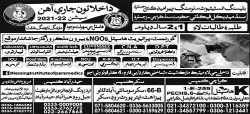 Blessing Institute of Paramedics has announced admissions for paramedical diploma in DPT, CNA, Pharmacy Technician, Health Tech, Ultrasound, Laboratory, Dispenser, Operation Theater, X-Ray, NCU, Anesthesia, Blood Bank & ICU in Karachi Campus, Sukkur Campus, Hyderabad Campus & Mirpurkhas Campus. Read newspaper ad for exact details.