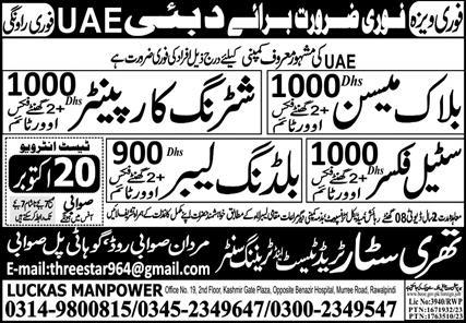 Luckas Manpower Overseas Employment Promoters jobs advertisement dated about 18 October 2023 in daily Express Newspaper invites application for the vacant post of building labor, shuttering carpenter, steel fixer and block mason in UAE, dubai UAE. Persons with Middle etc. education can apply.