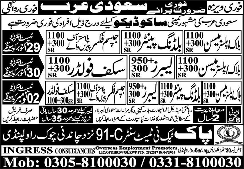 Ingress Consultancies Overseas Employment Promoters is looking for candidates for following posts as per job advertisement published in daily Express Newspaper of October 27, 2024 for location Riyadh, riyadh Saudi Arabia: