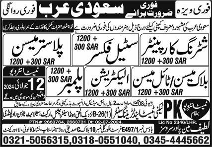 PK Techni Test & Training Center invites applications for job positions advertised in daily Express dated 11 July 2024 for following vacancies in Taif, tabuk Saudi Arabia.