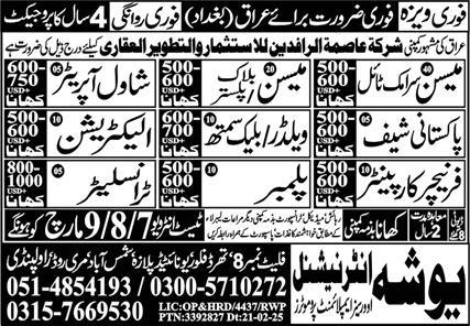 Yousha International Overseas Employment Corporation is looking for candidates for following posts as per job advertisement published in daily Express Newspaper of March 8, 2025 for location Baghdad, basra Iraq: