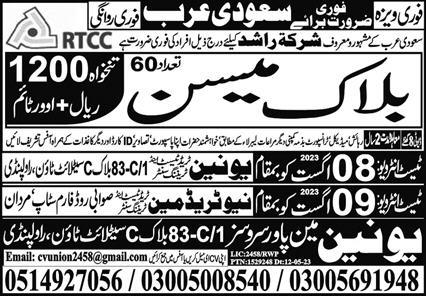 Union Manpower Services is looking for candidates for following posts as per job advertisement published in daily Express Newspaper of August 7, 2023 for location Riyadh, riyadh Saudi Arabia: