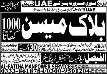Al Faisal Trade Test & Technical Training Center invites applications for job positions advertised in daily Express dated 25 August 2022 for following vacancies in Abu Dhabi, sharjah UAE.