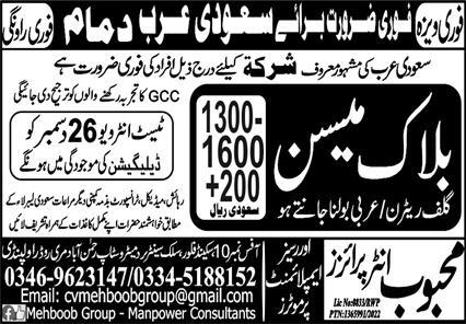 Mehboob Enterprises Overseas Employment Promoters invites applications for job positions advertised in daily Express dated 24 December 2022 for following vacancies in Dammam, al khobar Saudi Arabia.