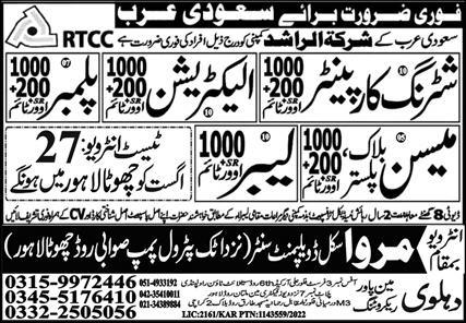 Marwa Skill Development Center Makkah, madina Saudi Arabia invites applications from eligible candidates for the post of mason, block mason, plaster mason, plumber, electrician, shuttering carpenter and labor as per advertisement of August 23, 2022 published in daily Express Newspaper. Persons with Middle and Matric etc. education can apply.
