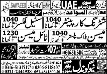 New Gondal Manpower Bureau is looking for candidates for following posts as per job advertisement published in daily Express Newspaper of August 5, 2023 for location Sharjah, abu dhabi UAE: