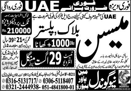 New Gondal Manpower Bureau jobs advertisement dated about 26 August 2023 in daily Express Newspaper invites application for the vacant post of block mason, plaster mason and mason in Abu Dhabi, sharjah UAE. Candidates with Matric etc. educational background will be preferred.