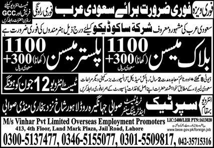 MS Vinhar Pvt Limited Saudi Arabia, saudi arabia Saudi Arabia invites applications from eligible candidates for the post of plaster mason and block mason as per advertisement of June 10, 2023 published in daily Express Newspaper. Persons with Intermediate, Matric and DAE etc. education can apply.