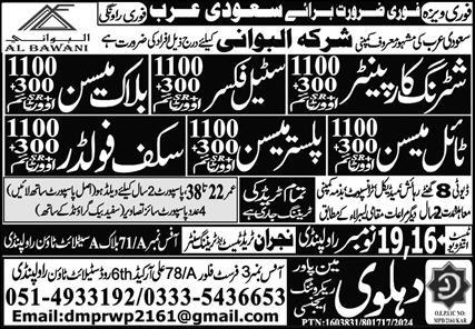 Dahlawi Manpower Recruiting is looking for candidates for following posts as per job advertisement published in daily Express Newspaper of November 15, 2024 for location Riyadh, makkah Saudi Arabia:
