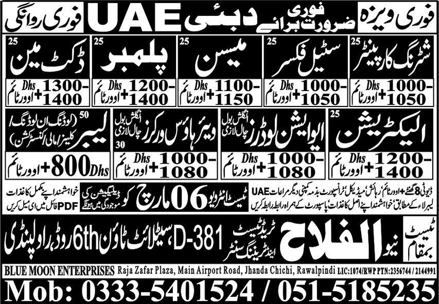 Vacant posts including Mason, Ware House Worker, Plumber, Aviation Loader, Steel Fixer, Electrician, Shuttering Carpenter, Labor and Duct Man are announced in Blue Moon Enterprises Dubai, dubai Dubai as per 5 March 2024 advertisement in daily Express Newspaper. Persons with Matric, Intermediate and Middle etc. education can apply.