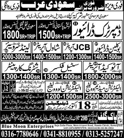Blue Moon Enterprises is looking for candidates for following posts as per job advertisement published in daily Express Newspaper of October 17, 2024 for location Riyadh, riyadh Saudi Arabia: