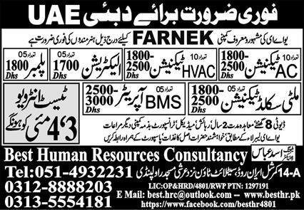 Vacant posts including bms operator, plumber, hvac technician, electrician, ac technician and multi skilled technician are announced in Best Human Resources Consultancy Abu Dhabi, dubai UAE as per 28 April 2023 advertisement in daily Express Newspaper. Bachelor, Intermediate, DAE, Matric and B.E etc. educational qualification will be preferred.
