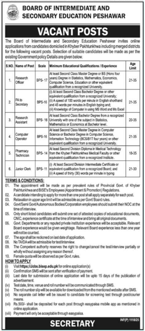 Board of Intermediate and Secondary Education BISE invites applications for job positions advertised in daily Mashriq dated 25 March 2025 for following vacancies in Peshawar, peshawar Khyber Pakhtunkhwa KPK Pakistan.