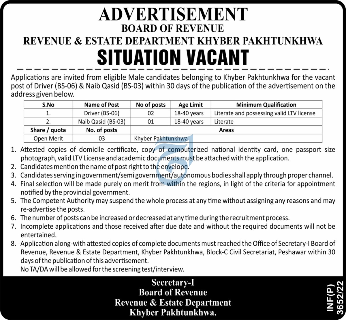 Revenue And Estate Department Peshawar, peshawar Khyber Pakhtunkhwa KPK Pakistan invites applications from eligible candidates for the post of naib qasid and driver as per advertisement of June 18, 2022 published in daily Aaj Newspaper. Educational qualifications required Middle and Primary etc.