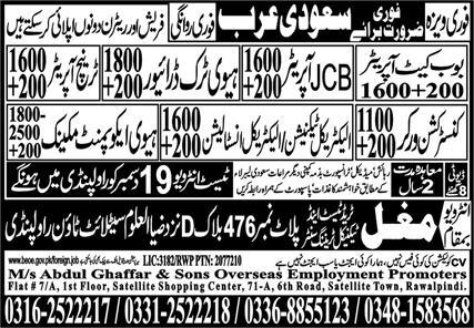 MS Abdul Ghaffar & Sons OEP jobs advertisement dated about 16 December 2023 in daily Express Newspaper invites application for the vacant post of electrical technician, construction worker, heavy truck driver, jcb operator, bob kat operator, heavy equipment mechanic, electrical installation and trench operator in Riyadh, riyadh Saudi Arabia. Preferred Education is Matric, Intermediate and Middle etc.