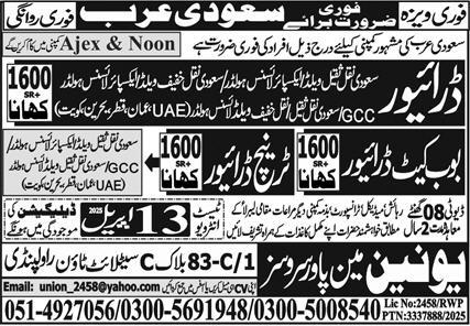 Apply at Union Manpower Services latest Overseas jobs in Driving and departments before closing date which is around April 13, 2025 or as per closing date in newspaper ad. Read complete ad online to know how to apply on latest Union Manpower Services job opportunities. Salary varies from 119000. Overtime might be allowed. On job transport, accommodation and medical facility is provided.