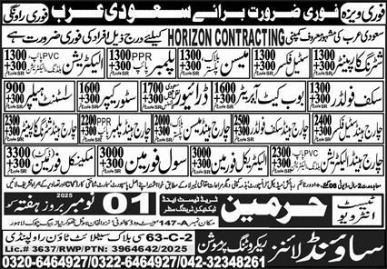 Vacant posts including electrician, chargehand mason, chargehand plumber, scaffolder, pipe plumber, chargehand shuttering carpenter, shuttering carpenter, plumber, mason, building electrician, chargehand electrician, bobcat operator, driver, electrical foreman, block mason, plaster mason, store keeper, mechanical foreman, civil foreman, assistant helper, chargehand steel fixer, chargehand scaffolder, mechanical foreman duct and steel fixer are announced in Harmain Trade Test & Technical Training Center Riyadh, dammam Saudi Arabia as per 28 October 2025 advertisement in daily Express Newspaper. Candidates with Intermediate, Matric, DAE, Bachelor, B.E and Others etc. educational background will be preferred.