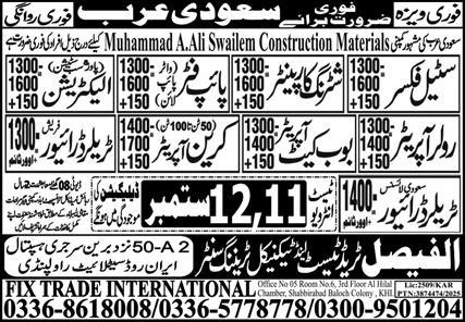 Al Faisal Trade Test & Technical Training Center Jeddah, dammam Saudi Arabia invites applications from eligible candidates for the post of steel fixer, bobcat operator, driver, crane operator, shuttering carpenter, trailer driver, electrician, roller operator and pipe fitter as per advertisement of September 5, 2025 published in daily Express Newspaper. Preferred Education is DAE, Matric, Intermediate and Bachelor etc.