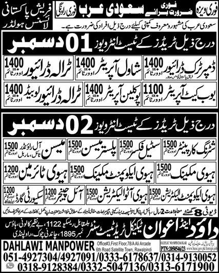 Dawood & Awan Technical Trade Test Center is looking for candidates for following posts as per job advertisement published in daily Express Newspaper of November 29, 2023 for location Dammam, riyadh Saudi Arabia: