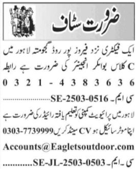 Private Company invites applications for job positions advertised in daily Jang dated 18 March 2025 for following vacancies in Gajju Matah Lahore, lahore Punjab Pakistan.