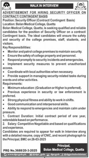 Bolan Medical College BMC Quetta, quetta Balochistan Pakistan invites applications from eligible candidates for the post of security officer as per advertisement of March 21, 2025 published in daily Jang Newspaper. Educational qualifications required Primary, Matric and Middle etc.