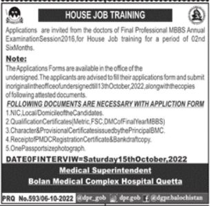Bolan Medical Complex Hospital is looking for candidates for following posts as per job advertisement published in daily Jang Newspaper of October 7, 2022 for location Quetta, quetta Balochistan Pakistan: