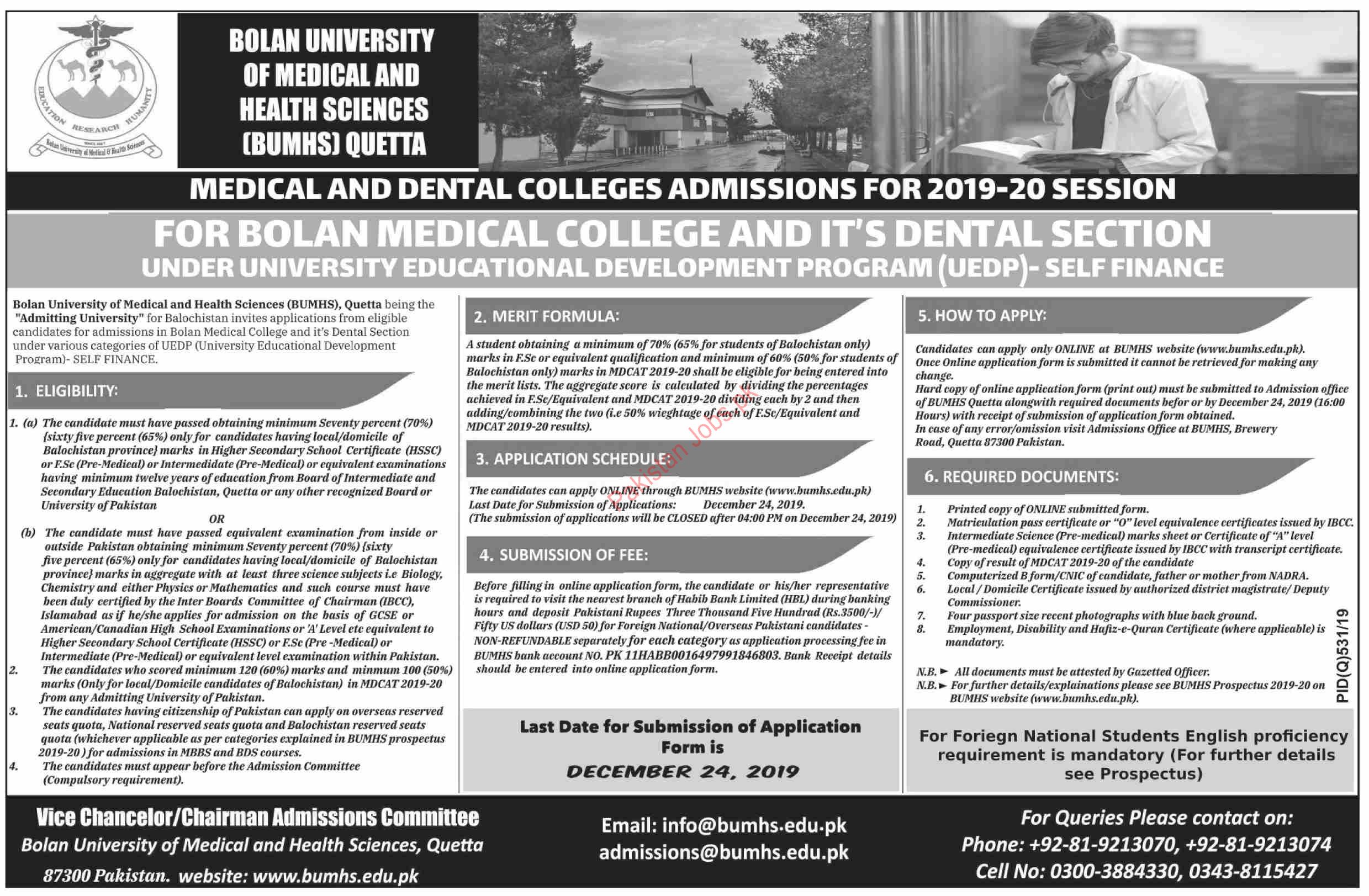 Bolan University of Medical & Health Sciences, Medical & Dental Colleges Admissions Session 2020 under University Educational Development Program UEDP Self Finance in Quetta. Read newspaper ad for exact details.