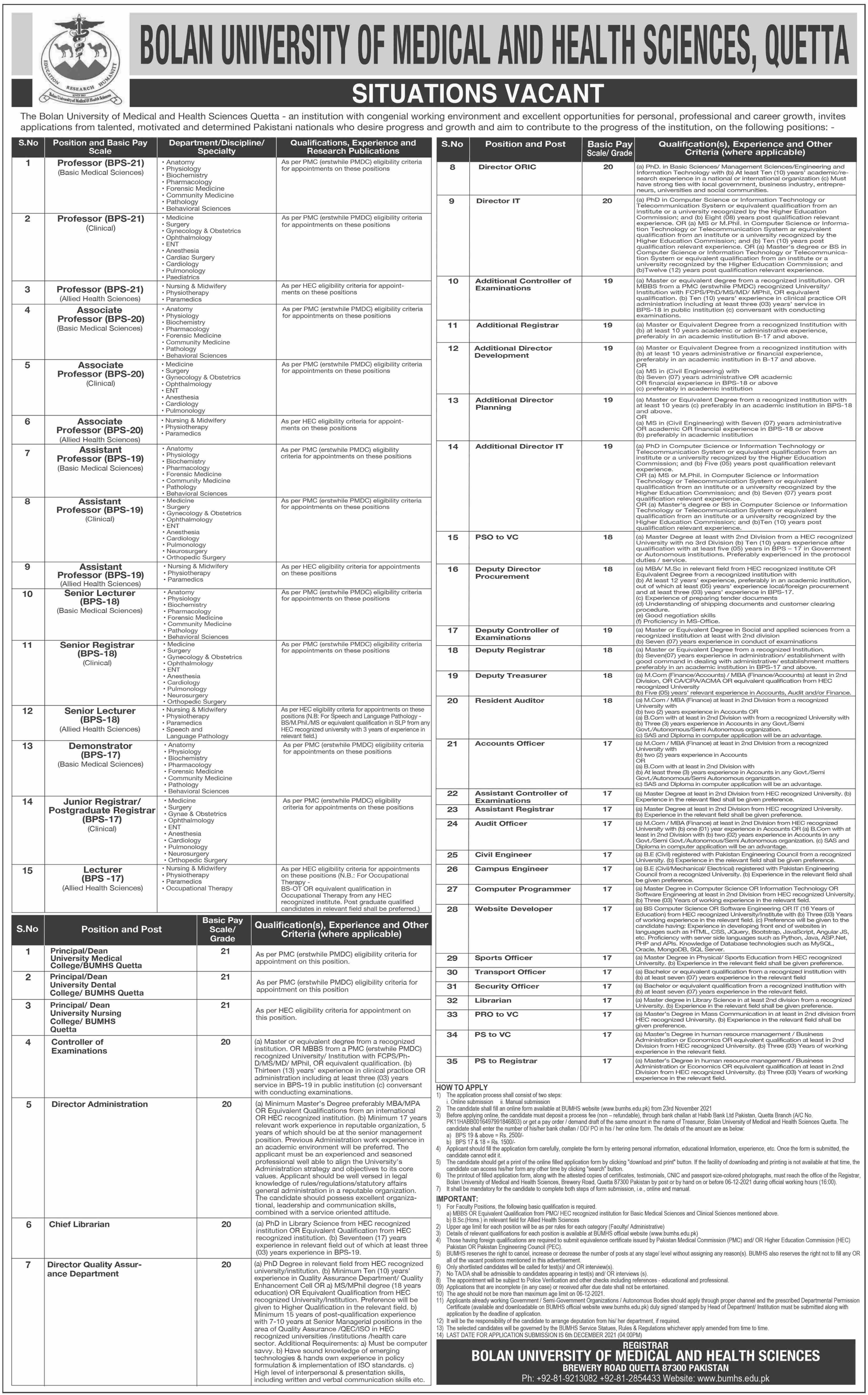 Balon University of Medical & Health Sciences BUMHS Quetta, Pakistan invites applications from qualified expert and experience professionals for the posts of Professor, Associate Professor, Assistant Professor, Senior Lecturer, Lecturer, Registrar, Senior Registrar, Demonstrator, Junior Registrar, Postgraduate Registrar, Principal, Dean, Controller of Examination, Director Administration, Chief Librarian, Director Quality Assurance, Director ORIC, Director, IT, Additional Controller of Examination, Additional Registrar, Additional Director Development, Additional Director Planning, Additional Director IT, PSO, Deputy Controller of Examination, Deputy Registrar, Deputy Treasurer, Resident Auditor, Accounts Officer, Assistant Controller of Examination, Assistant Registrar, Audit Officer, Civil Engineer, Campus Engineer, Computer Programmer, Website Developer, Sports Officer, Security Officer, Librarian, PRO, Public Relation Officer, PS, Personal Secretary in Quetta.