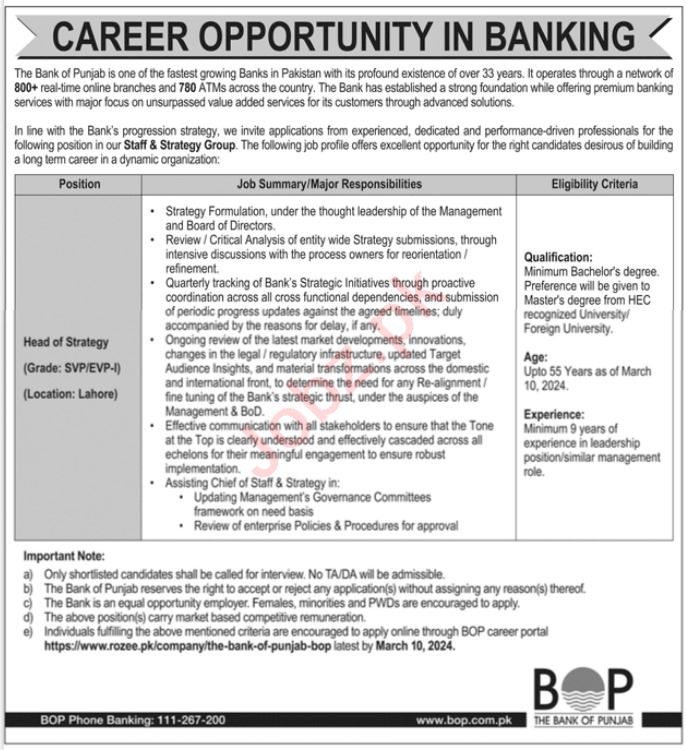 Vacant posts including head of strategy are announced in The Bank of Punjab BOP Lahore, lahore Punjab Pakistan as per 25 February 2024 advertisement in daily Jang Newspaper. Preferred Education is Master and Bachelor etc.