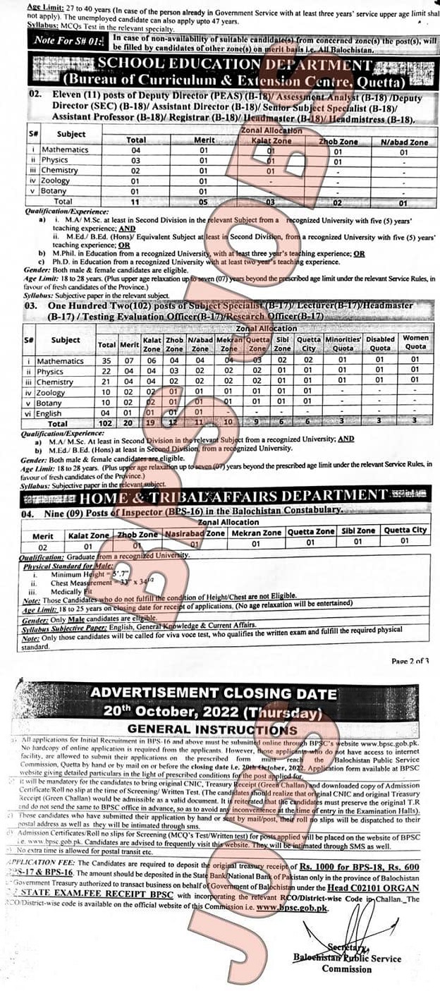 Health Department, School Education Department, Bureau of Curriculum & Extension Centre, Home & Tribal Affairs Department, BPSC Balochistan Public Service Commission is looking for candidates for following posts as per job advertisement published in daily Other Newspaper of August 30, 2022 for location Quetta, quetta Balochistan Pakistan: